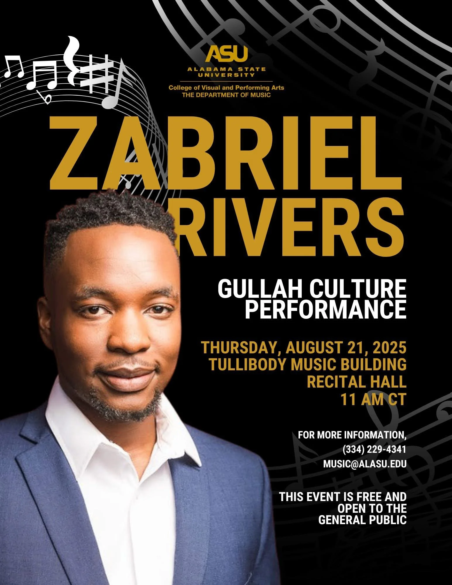 Zabriel – Singer and Voice of the Gullah Geechee Nation brings the power of storytelling, music, and heritage in A Gullah Evening with Zabriel — a one-man show that brings the rich traditions of the Gullah Geechee people to life. With voice, rhythm, and history intertwined, Zabriel carries the sound of a nation and shares it with the world.